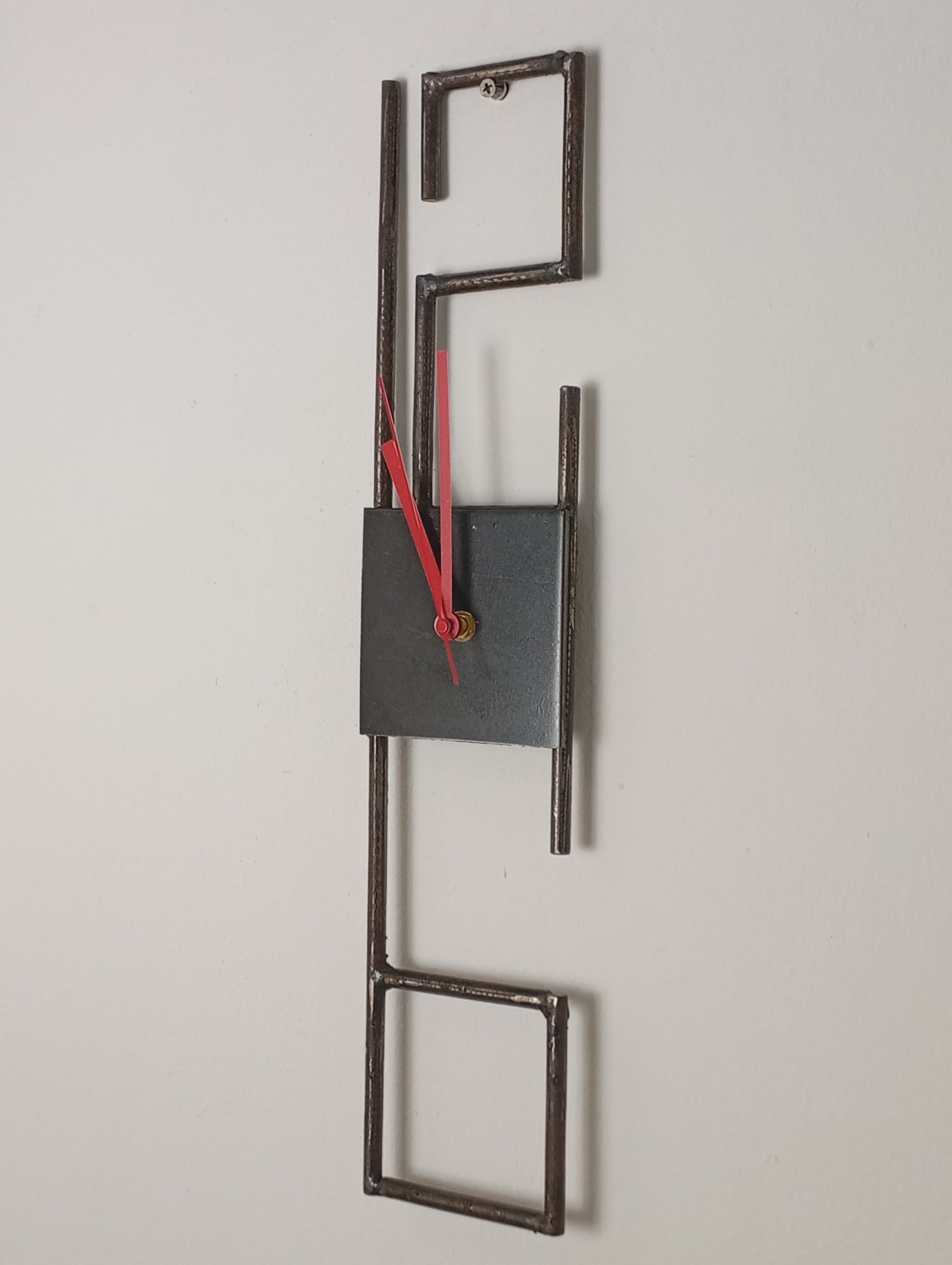 นาฬิกาแขวนผนังทำมือ ดีไซน์ทันสมัย ผลิตจากโลหะเคลือบแลคเกอร์ที่ทนทาน เพิ่มความเงางามและป้องกันการเกิดสนิม เข็มนาฬิกาสีแดงสดตัดกับพื้นหลังอย่างโดดเด่น ทำให้อ่านเวลาได้ง่าย