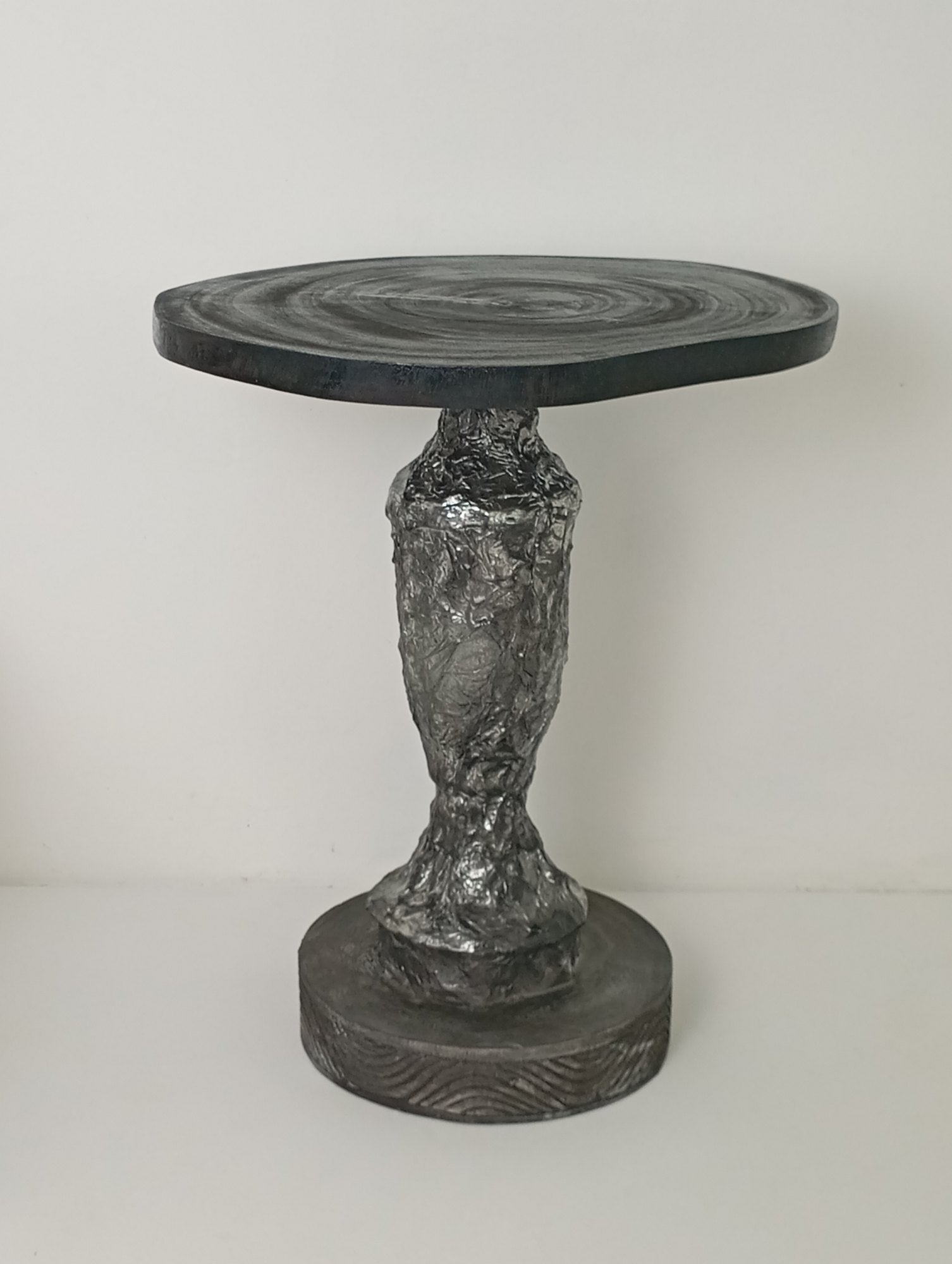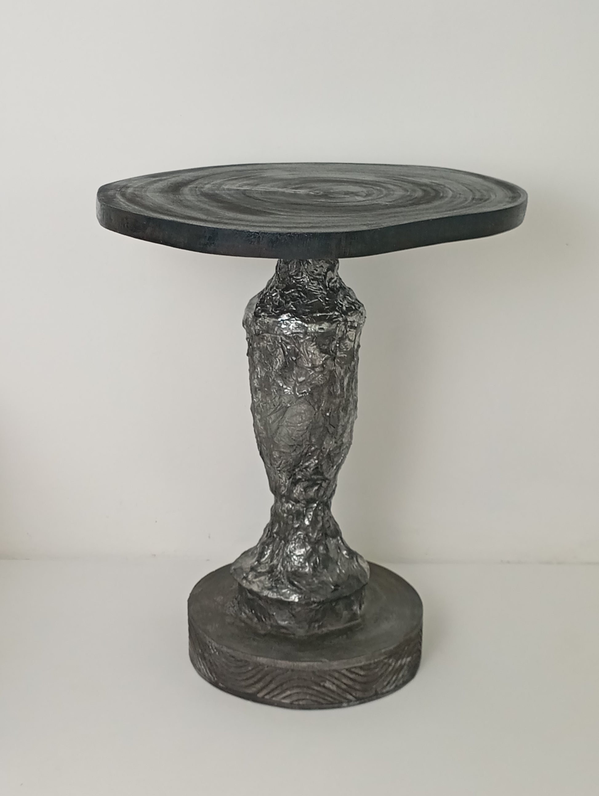 โต๊ะข้างดีไซน์เฉพาะตัวในสไตล์ศิลปะร่วมสมัย ขาทำจากไม้ตกแต่งด้วยฟอยล์และเคลือบด้วยเรซิ่นอีพ็อกซี่ที่แข็งแรง ช่วยเพิ่มพื้นผิวที่โดดเด่นและความทนทาน ส่วนของท็อปโต๊ะทำจากไม้ เคลือบแลคเกอร์สีดำเพื่อขับลายไม้ตามธรรมชาติและสร้างความโดดเด่นตัดกับฐานโต๊ะที่มีพื้นผิวไม่เหมือนใคร