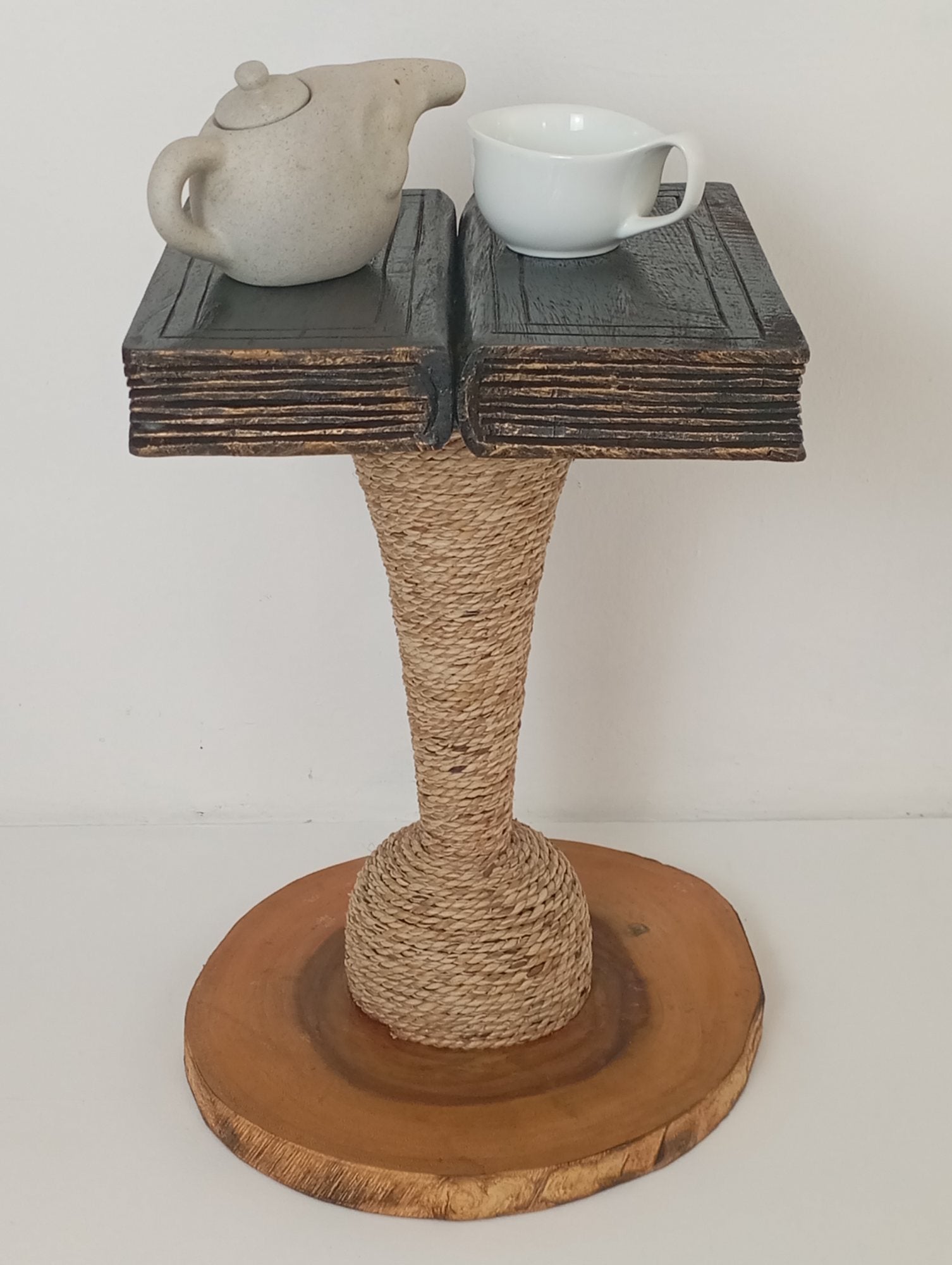 The tabletop is crafted from wood and designed in the shape of two antique books.