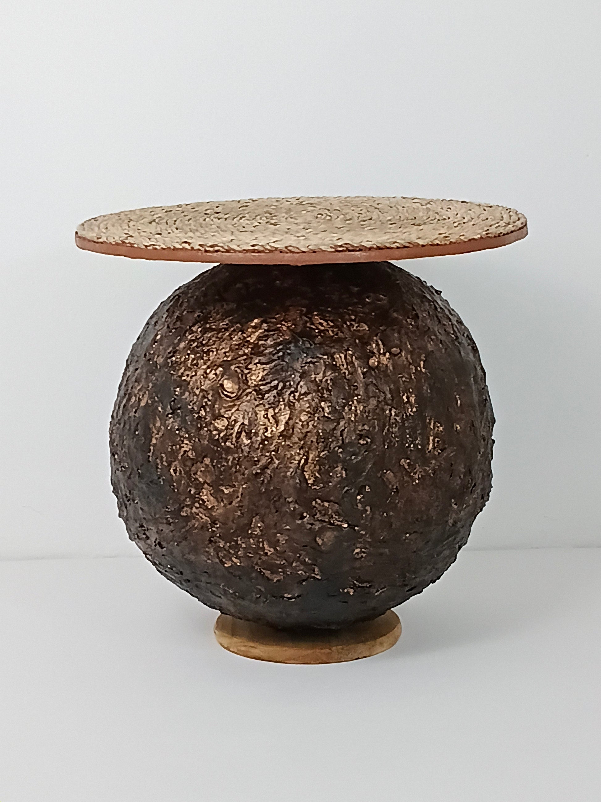 The base is made of wood shavings mixed with glue, giving it a unique texture. The spherical base is hollow inside, making the construction lighter while remaining strong and stable.