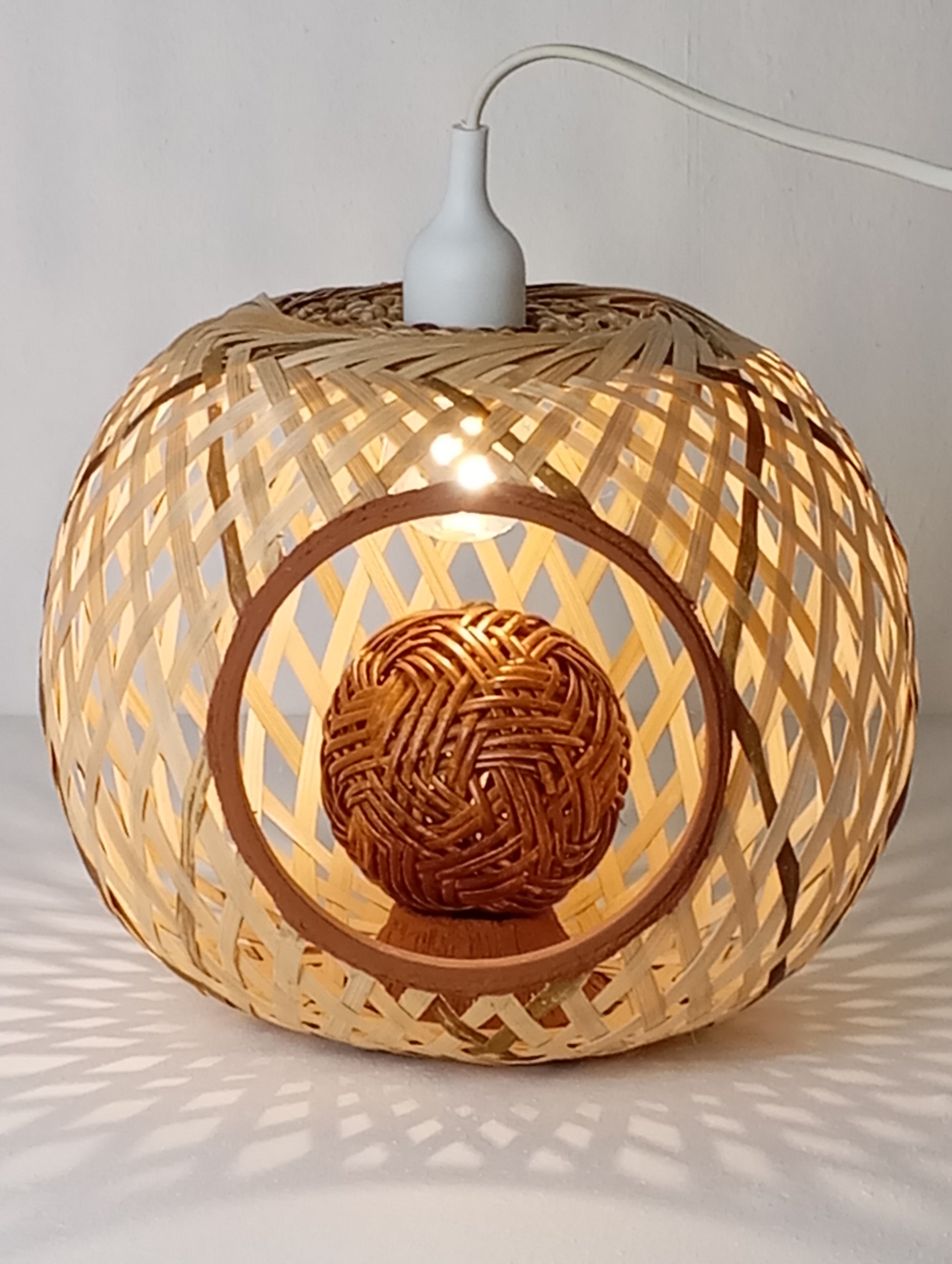 โคมไฟแฮนด์เมดดีไซน์เฉพาะตัว ผลิตจากหวายธรรมชาติ ตัวโคมแบบสานโปร่งให้แสงนุ่มนวลและเงาลวดลายสวยงามบนผนัง
