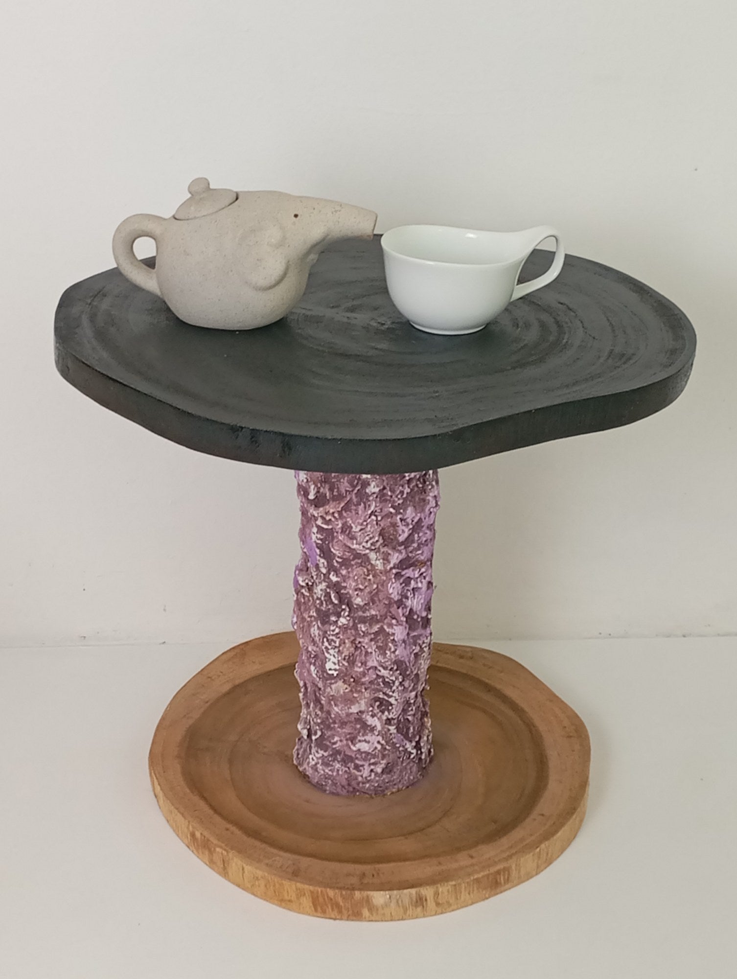 Add a touch of art to your living room with our Coffee Table Art. Crafted with wooden material and adorned with paper-mache, this table is a unique piece that stands out. With a height of 41 cm and a table top of 36-39 cm, it's not just visually appealing but also functional. The violet-colored leg and black finish add a pop of color to your space.