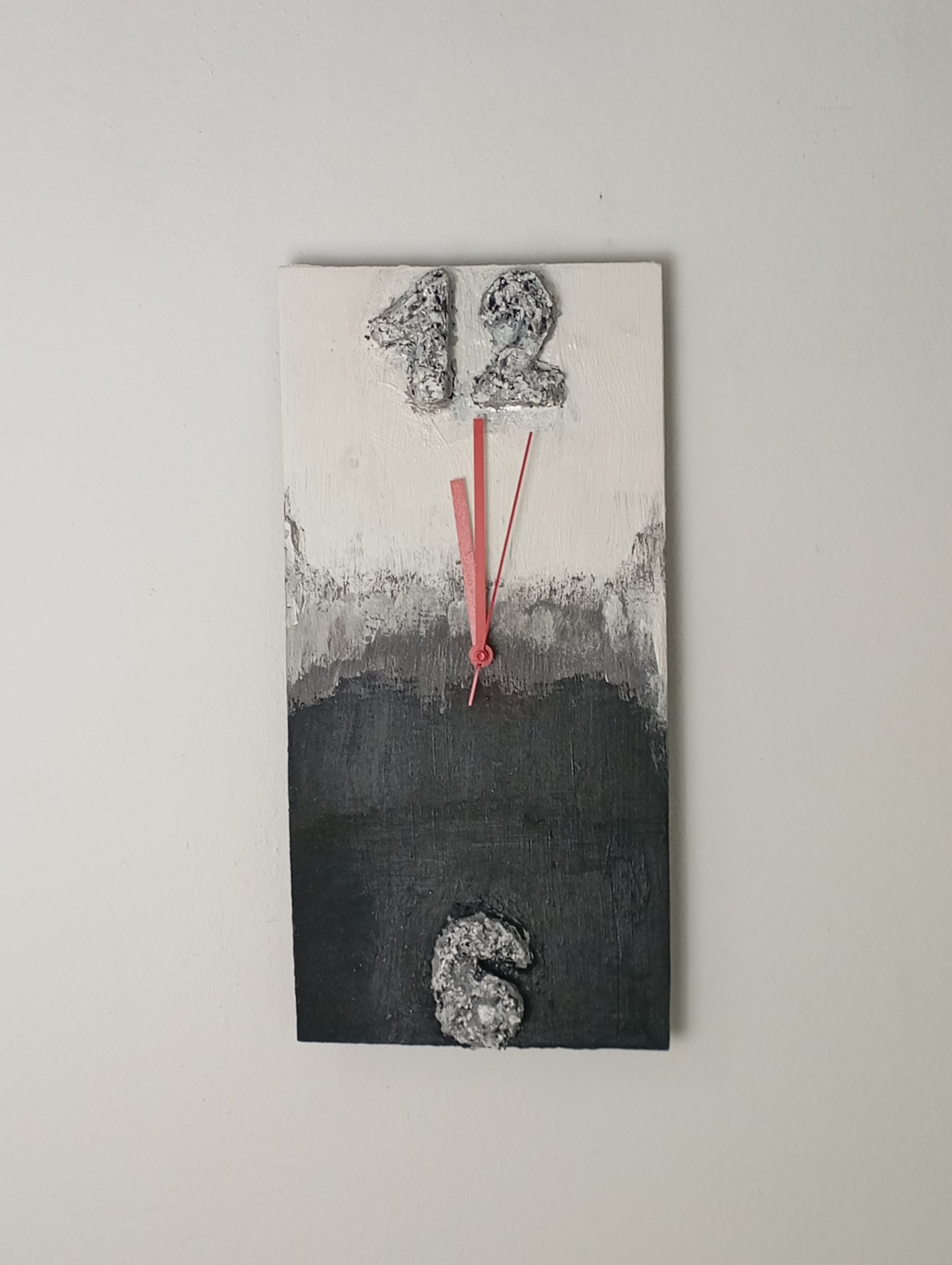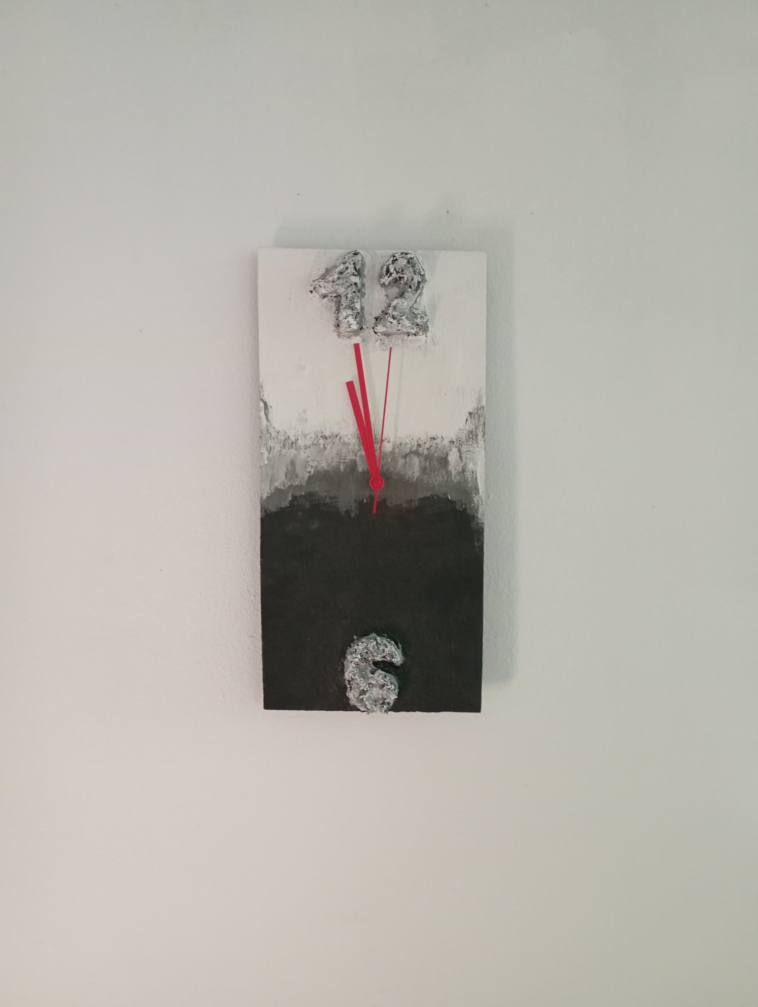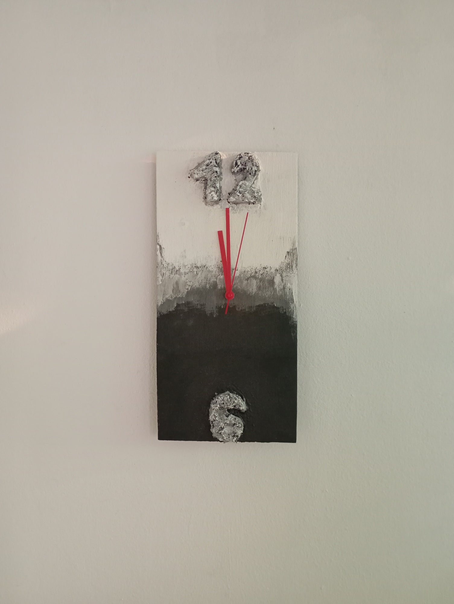This handmade wall clock is crafted from plywood and hand-painted with acrylic paint. It features a unique design with raised numbers 12 and 6, and a harmonious blend of white, black, and gray colors, adding a modern and minimalist style to any space.